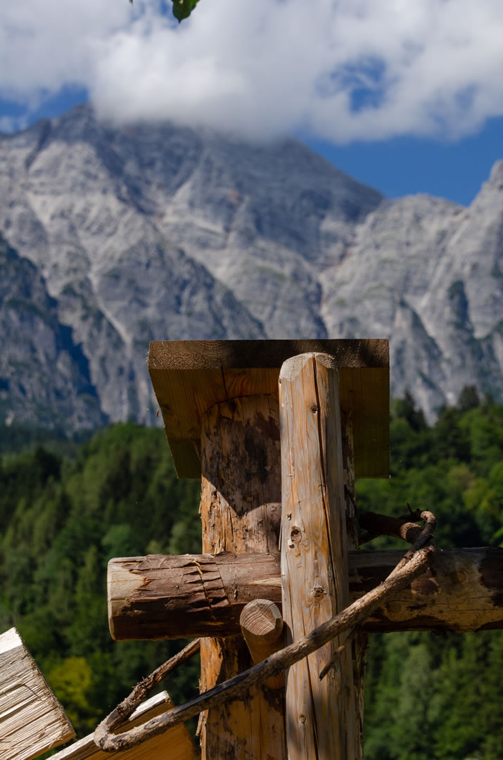 Ein „Dach“ aus Lärchenholz schützt die Säulen vor Verwitterung.