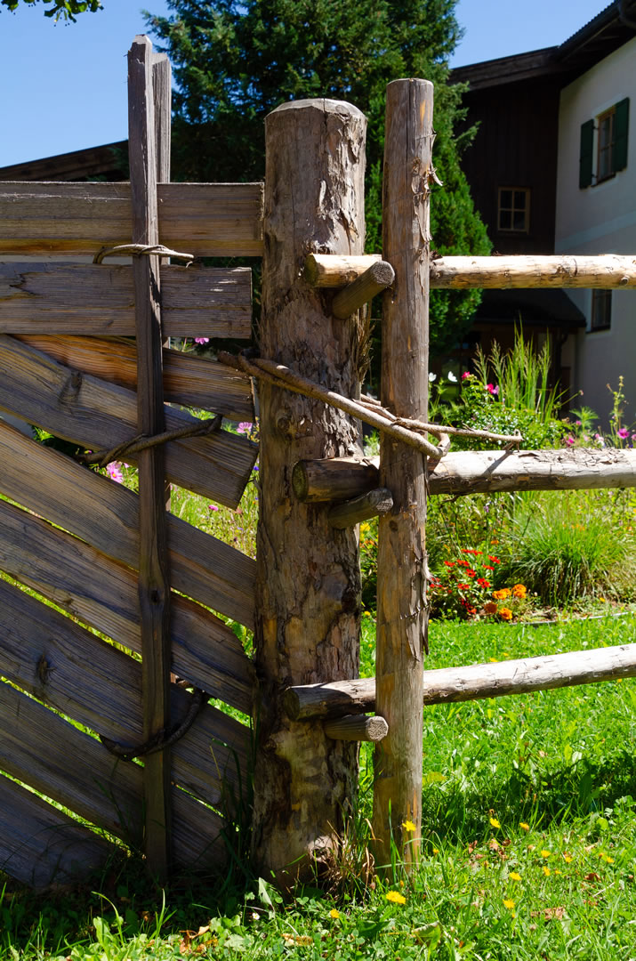 Beim Stangenzaun verwendet man, vor allem für die „Säule“, meist heimisches Lärchenholz, weil es witterungsbeständiger als Fichte ist.